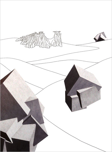 Les mirages reprennent les éléments de la série architecstones mais les intègrent cette fois dans un contexte spatial, celui d’un désert. Ces architectures, sortes de bunker, semblent abandonnées là, témoins d’une civilisation disparue?