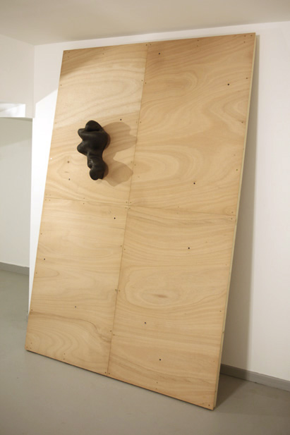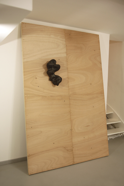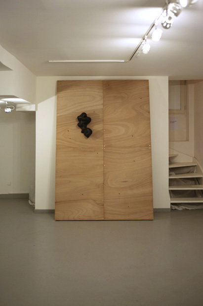 panneaux de contreplaqué brut, tasseaux, écroux à frapper, organe minéral noir (céramique, 2008) |158x240x30cm | 2013