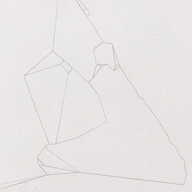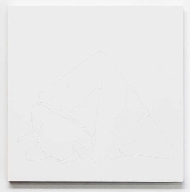 A première vue, un carré blanc. Mais en se rapprochant et en se déplaçant une image apparaît. Il faut jouer avec l’angle de vue pour faire accrocher la lumière sur les minces sillons du dessin gravé sur la surface. L’image représentée est une pépite de pyrite, mais elle évoque davantage une ruine de pyramide.