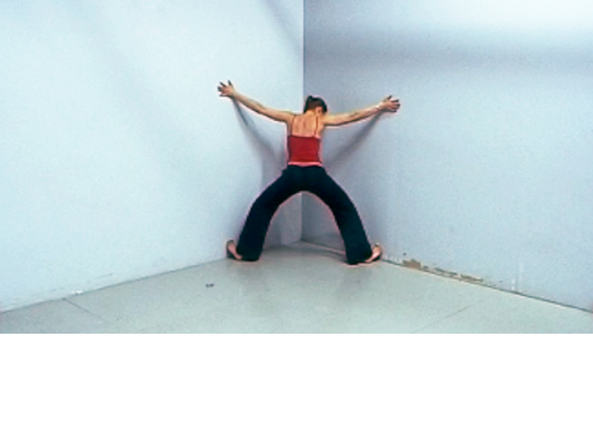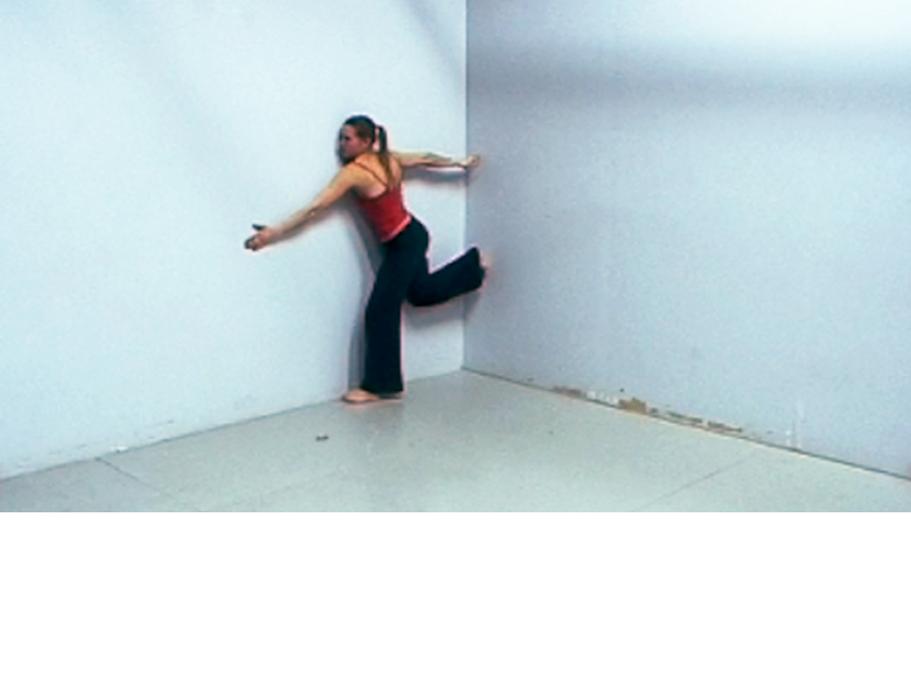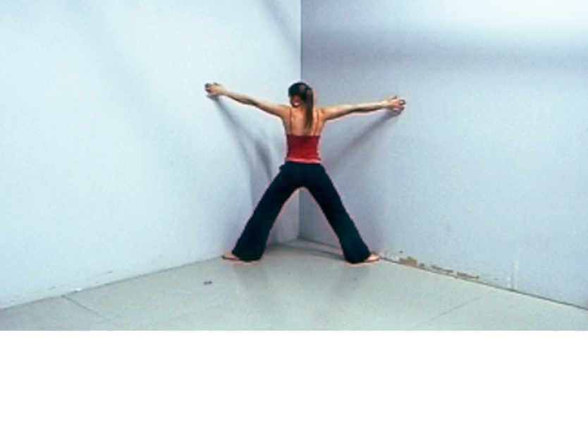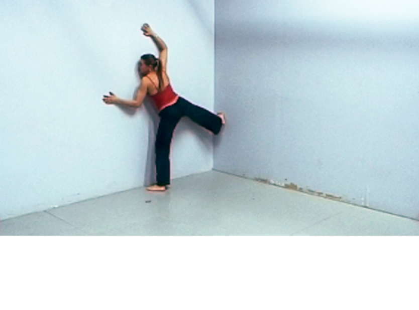 L’espace choisi pour l’action est un coin. Le plan, vertical notamment, et l’intersection de plans comme le coin en particulier font partie de mon univers imaginaire et donnent lieu à des improvisations corporelles liées à la rêverie d’un vide fantasmé. traversée se veut l’interprétation d’une escalade imaginaire dans un espace dépourvu de prises.