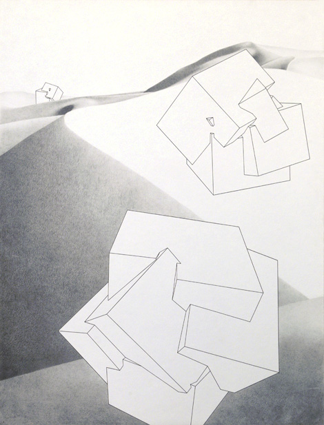 Les mirages reprennent les éléments de la série architecstones mais les intègrent cette fois dans un contexte spatial, celui d’un désert. Ces architectures, sortes de bunker, semblent abandonnées là, témoins d’une civilisation disparue?