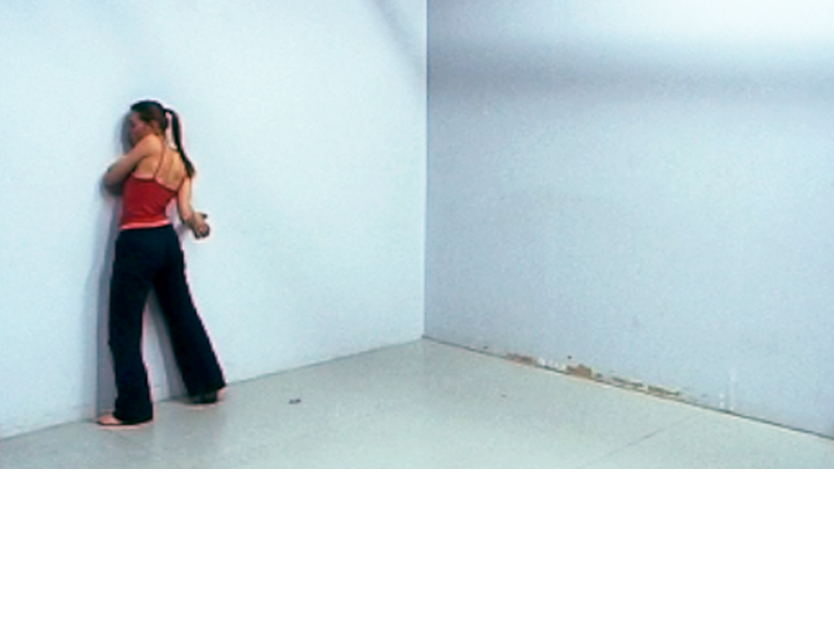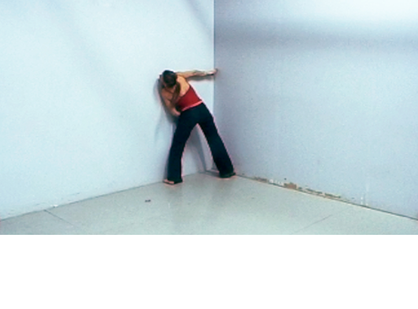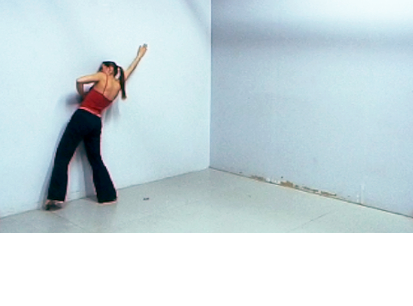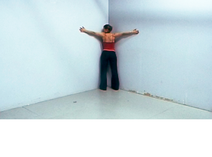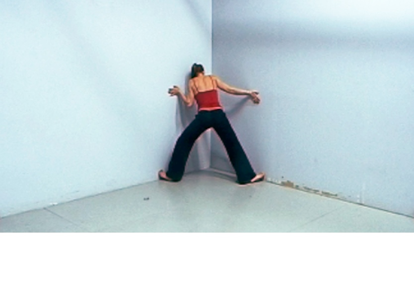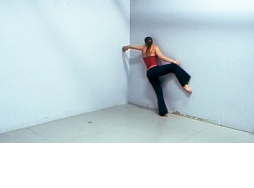 L’espace choisi pour l’action est un coin. Le plan, vertical notamment, et l’intersection de plans comme le coin en particulier font partie de mon univers imaginaire et donnent lieu à des improvisations corporelles liées à la rêverie d’un vide fantasmé. traversée se veut l’interprétation d’une escalade imaginaire dans un espace dépourvu de prises.