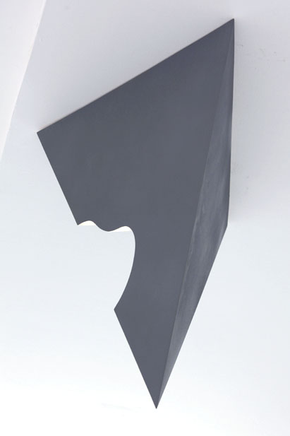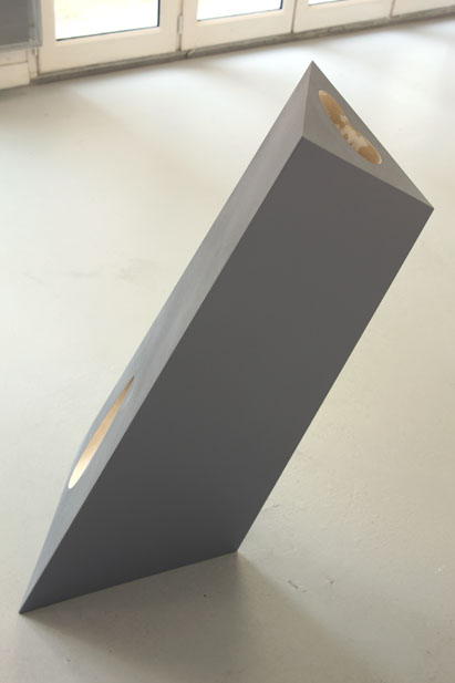 En fonction du point de vue, la perception du volume des éléments disparaît pratiquement, à l’exception des parties «érodées» qui se mettent à flotter. Ce jeu invite le spectateur à se déplacer autour/dans l’installation.